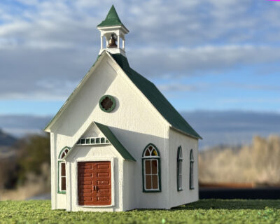 A small community church. The prototype is still in use in Wyoming. The kit contains laser-cut siding, uncut acetate for glazing, 3D-printed windows, doors, and some trim. Stripwood is also included as trim.