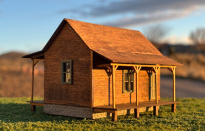 Laser-cut wood and 3D printed “rock” foundation, windows, and doors. Uncut acetate sheet included for glazing. Roofing material not included but wooden shake shingles, tarpaper, or corrugated tin would be prototypical. While not based on a specific prototype, the layout is typical of many modest miners cabins in a mining town of the era.